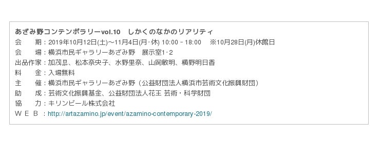 ※「学芸員によるギャラリートーク」以外は、事前の申込みが必要です。申込み方法などの詳細は、ホームページ(http://artazamino.jp/event/azamino-contemporary-2019/)をご確認下さい。