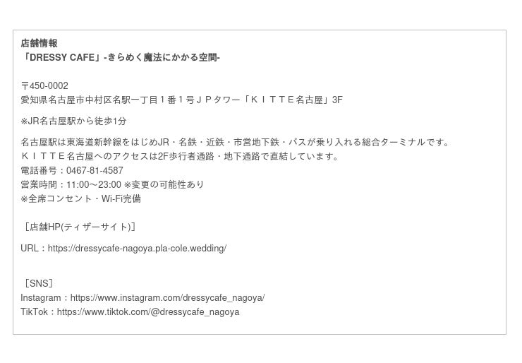 というのは、エイプリルフールのウソですが、2023年春、名古屋駅直結の JPタワー名古屋内の商業施設「KITTE名古屋」に本当にウェディングドレスの試着やフォト撮影ができるウェディングのテーマパークカフェ『DRESSY CAFE』をオープンすることが決定しております。