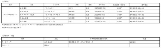 2024年5月20日(月)~21日(火)にバンコク(タイ)で開催される「バンコク2024アジアリレー」に派遣する日本代表選手が別紙の通り決定しましたのでお知らせいたします。本大会にはバンコク2023アジア陸上競技選手権女子400m日本代表の松本奈菜子(東邦銀行)、久保山晴菜(今村病院)をはじめ、アジアリレーの選考競技会として開催された日本グランプリシリーズ 出雲陸上の女子400mの結果から計5名の代表選手が選出されております。>>日本代表オフィシャルサイトはこちら