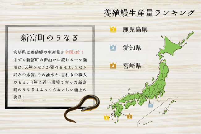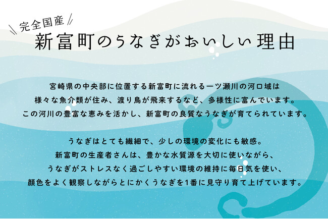 7/24(水)もうすぐ土用丑の日です!!! 宮崎県は養殖鰻の生産量が全国3位を誇ります。その中でも新富町は養鰻が盛んな地域で、新富町の街沿いに流れる一ツ瀬川は天然うなぎが獲れるほど、うなぎ好みの水質。その湧き水と目利きの職人のもと、自然に近い環境で育った新富町のうなぎはふっくら美味しい極上の逸品です。