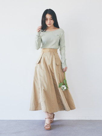 生地感が夏っぽい、マットな光沢感のある素材を使いました!縦の切り替えラインが入っており、縦長に見せてくれるので、スタイルアップしてくれます。腰周りが気になる方でも、二重になっているので、着痩せできるのかなと思います。腰から裾先まで広がったデザインにしています。