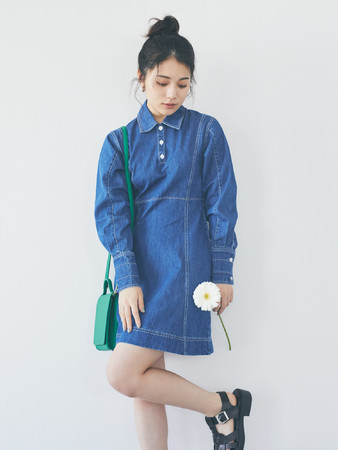 少し襟を大きめにして、個性的なデニムワンピースにしました。手首の部分が長くキュッとしまっているので、袖の部分がパフスリーブっぽくなり、女の子らしい雰囲気で着ることができます。腰の部分をかなり高い位置に設定しているので、脚長効果も!後ろの部分にはゴムを入れていて着やすいようにしています。