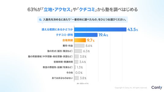 アンケート調査から見えてきたのは、「合格実績」を重視する保護者が多い一方で、全体の6割以上がいきなり実績を比較するのではなく、「立地やクチコミ」から塾を探し始めているという現状です。