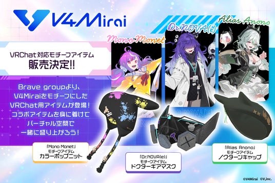 Brave group US Inc.(本社:米国サンフランシスコ、CEO:Norikazu Hayashi、株式会社Brave group 100%子会社、以下「Brave group US」)が展開する英語圏特化VTuberプロジェクト「V4Mirai(読み:ブイフォーミライ)」は、株式会社V(本社:東京都品川区、代表取締役兼CEO:藤原光汰、以下「V」)とともに、VRChatで使用できる公式3D衣装と公式3Dアイテムを開発いたしました。本日2025年7月1日(火)より、「Brave group US Official Store」ならびにBOOTHショップ「V WORLD」で販売開始いたします。