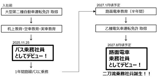 今後は約1年間、路線バスの乗務社員として実務経験を積み、その後、路面電車の教育・国家試験受験を経て、路線バスも路面電車も運転できる乗務社員としてデビューする予定です。