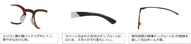 軽量のポリアミド樹脂を用いて、ボストンやウェリントンなどの重厚な王道ヴィンテージシルエットを再解釈。鼻パッド部分を覆うシリコンや、テンプル(つる)のラバーにより、ずれにくく軽やかなかけ心地を実現。現代技術と機能素材を駆使した工夫がほどこされています。