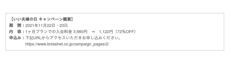 株式会社IBJ(代表取締役社長:石坂 茂、東証一部:6071)が運営する、真剣に婚活に取り組む方へ向けた婚活サイト『ブライダルネット』は、2021年11月22日(いい夫婦の日)の本日から明日までの2日間限定で、ブライダルネットの1ヶ月プランが 1,122円(通常3,980円)となる特別キャンペーンを開催します。