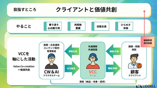 SNS・インフルエンサーマーケティングを中核に、ファン・コミュニティとAIを掛け合わせた「人を基軸としたマーケティング事業」を展開するLIDDELL株式会社(本社:東京都港区、代表取締役:福田 晃一、以下リデル)は、既存の営業・CSチームおよび運用・制作・ディレクションチームを廃止し、バックオフィスやコーポレート部門を含む全社員をVCC(Value Co-creation=価値共創)チームへ統合した組織変革を開始いたします。