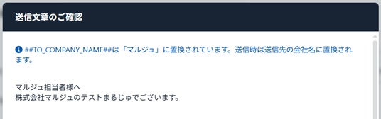 送信文章内に送信先の会社名、送信元の担当者名を差し込める機能です。当機能を利用することで