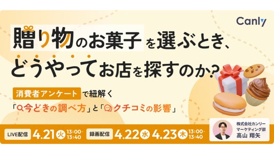 Google ビジネスプロフィール、Yahoo!プレイス、Appleマップなどの3大地図媒体、HP、アプリ、SNSなどの店舗集客媒体の一元管理サービス「カンリー店舗集客」の開発・提供を行う株式会社カンリー(所在地:東京都品川区、代表取締役:辰巳 衛,秋山 祐太朗)は2026年4月21日(火)・22日(水)・23日(木)の3日程で「贈り物のお菓子を選ぶとき、どうやってお店を探すのか?~消費者アンケートで紐解く「今どきの調べ方」と「クチコミの影響」~」をオンラインで開催いたします。