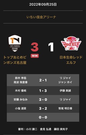 トップおとめピンポンズ名古屋と日本生命レッドエルフの試合は3-1でトップおとめピンポンズ名古屋が勝利しました。