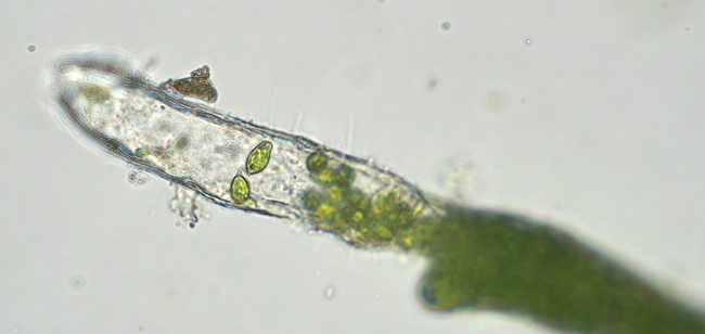顕微鏡観察の結果、「マリモ」「タテヤママリモ」と同様に枝分かれした糸状体が絡み合って球形の群体を作っていました(図3)。また、「マリモ」ではほとんど観察例がない遊走子(鞭毛を持って水中を遊泳する胞子:図4)も見つかりました。