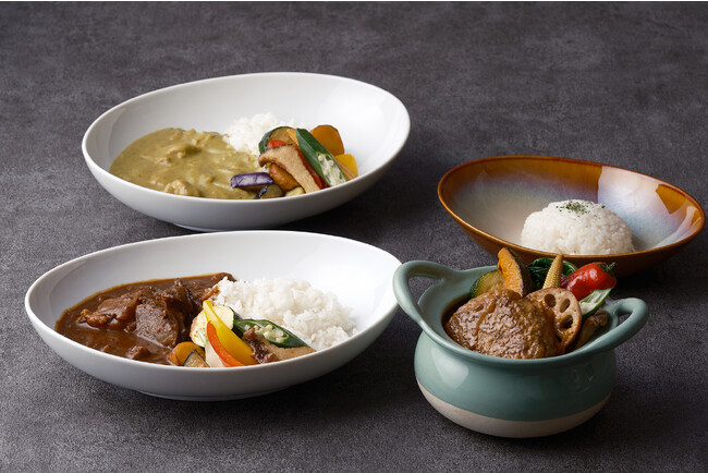 毎年恒例の「夏のカレーフェア」は、フランス料理の技法でじっくりと丁寧に煮込んで、牛肉の旨みが凝縮された奥深い味わいの「牛ほほ肉のフォンド・ヴォー ビーフカレー」、青唐辛子のピリッとした辛さがクセになり、ハーブとココナッツミルクを加えることでより一層コクが深まり、爽やか香りとマイルドな風味が楽しめる「夏野菜のグリーンカレー」、ココナッツミルクの甘みが引き立つカレースープにハンバーグと旬の野菜をたっぷり入れた、食べ応えがある贅沢な「具沢山ハンバーグスープカレー」を揃え、それぞれ異なる風味や辛さをお楽しみいただけます。さらに、オプションでカレーに合う栄養バランスを整えるサラダや季節のフルーツをご用意いたしました。バラエティ豊かなカレーは、ランチやディナーにはもちろん、気軽に食べられる軽食としてもおすすめです。