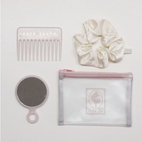 温泉やサウナ、お風呂上がりにぴったりなコーム、シュシュ、ミラーの3点がセットになっています。コームは目を荒くしているのでトリートメントをした後の馴染ませる用のコームとしても使えます。