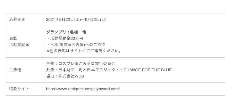 コスプレ海ごみゼロ実行委員会(委員長:天野知寿子)が主催するコスプレde海ごみゼロアワード2021(募集期間:2021年5月22日(日)~8月22日(日))にて、世界中から136の応募があり、グランプリ他4名の受賞者が決定しました。