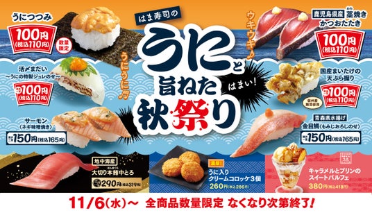株式会社はま寿司(代表取締役社長:町野 岳 本社:東京都港区)が展開する100円寿司チェーン「はま寿司」は、11月6日(水)より、「はま寿司のうにと旨ねた秋祭り」を全国の店舗で開催します。
