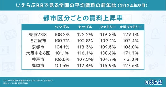 一方、大阪中心6区の近隣に位置する神戸市では、大型ファミリーの平均賃料の上昇率が75.3%と大幅に減少しています。