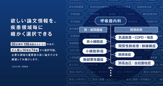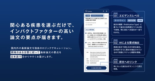 関心のある疾患を選ぶだけで、国内外の主要ジャーナルに掲載された論文を、独自の検索式と重み付けに基づいて厳選します。これにより、インパクトファクターの高い論文の要点が効率的に手元に届きます。