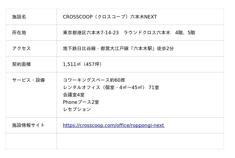 従来の「fabbit六本木」が主にスタートアップやフリーランスなどの利用を想定していたのに対し、「CROSSCOOP六本木NEXT」では、中小企業・中堅企業に加え、大企業の新規事業部門や分室、プロジェクト拠点としての利用ニーズに対応します。企業の成長フェーズや多様な事業活動に応じた、より柔軟で機能的なオフィス環境を提供してまいります。