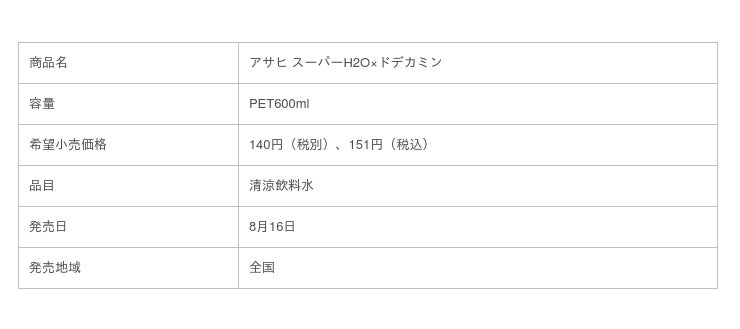 発売から長年お客さまにご好評いただいている『アサヒ スーパーH2O』と「ドデカミン」のコラボレーション商品です。『アサヒ スーパーH2O』の特長であるハイポトニック設計※1、ミネラル※2配合はそのままに「ドデカミン」の特長である12種類の元気成分(ガラナ・マカ・アルギニンなど)を配合しています。水分・塩分補給と同時にエナジーチャージも可能となり、仕事の合間や運動後のリフレッシュしたい時にぴったりです。また夏場にうれしい熱中症対策商品※3です。