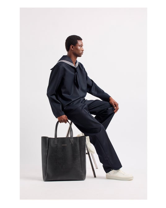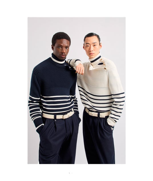 アトランティックコレクションは、フォーマルなスタイルとコンテンポラリーなファッションを共存させ、ウールのスーツ、レザーのボンバージャケット、ワックス仕上げのテクニカルな生地で作られたパンツ、ボーダーストライプのニットウエアなど様々なアイテムで展開されます。