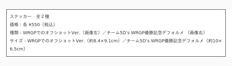 「チーム5D's」メンバーの"大会中のオフショット"にスポットを当てた豪華描き下ろしイラストを始め、数多の好敵手達が熱い決闘を繰り広げる「WRGP」をテーマにしたPOP UP SHOPです。