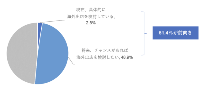 ■海外出店に前向きな飲食店は半数超。具体的に検討している割合は、5年前の調査時から減少。