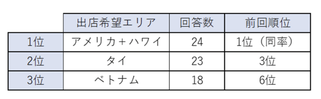 ■出店希望エリアは、アメリカが根強い人気。2位にタイ、3位ベトナムと続く。