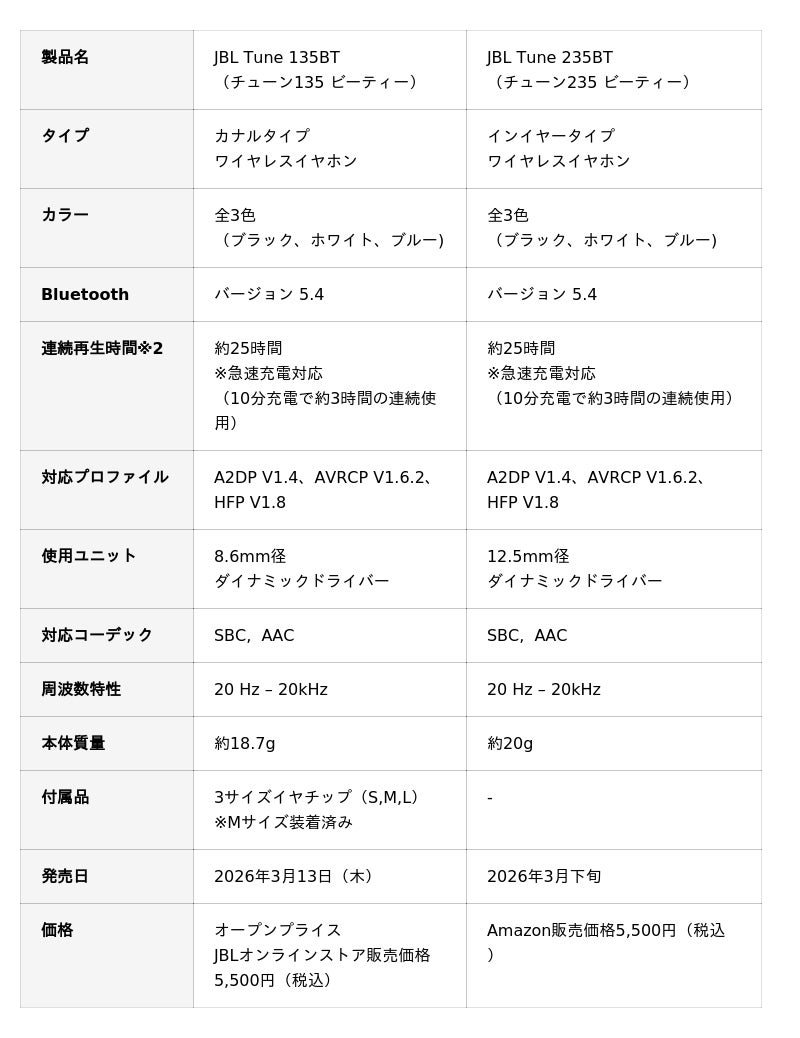 ハーマンインターナショナル株式会社(本社:東京都千代田区、代表取締役:桑原拓磨)は、アメリカ カリフォルニア発祥の世界最大級のオーディオブランドであり、日本においてワイヤレススピーカー8年連続販売台数No.1※1に輝く「JBL」から、カナルタイプワイヤレスイヤホン「JBL Tune 135BT」を2026年3月12日(木)より発売、またインナーイヤータイプワイヤレスイヤホン「Tune 235BT」をAmazon限定にて2026年3月下旬より発売いたします。