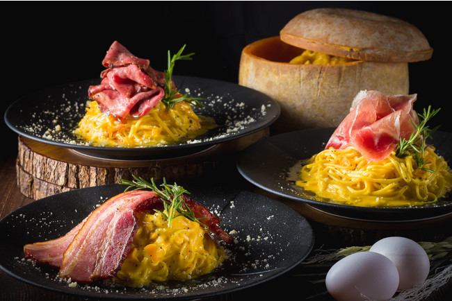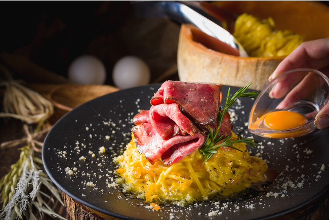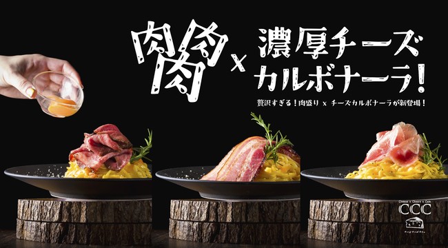 CCC自慢の「ミモレットチーズの濃厚カルボナーラ」の新シリーズは、ベーコンやローストビーフなどお肉を豪快に乗せた【贅沢すぎる肉盛りカルボナーラ】