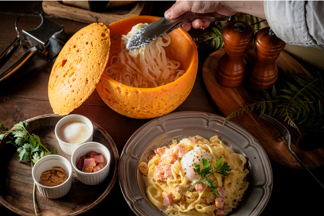ミモレットチーズをくりぬいた器で、パスタにチーズの香り付けをしながらお客様の目の前でお作りする「ミモレットチーズの濃厚カルボナーラ」は、チーズの壁を削りながら仕上げる演出が好評の人気商品です。ミモレットチーズは熟成が進むと外皮が硬くなり、無数の穴が空きます。中身は鮮やかなオレンジ色をしており、カラスミのような深い旨みがあります。クリーミーなカルボナーラに、ミモレットチーズ特有の香りがアクセントとなり濃厚に仕上がったもちもちのパスタは、最後はお皿に盛り付け、温泉たまごを落としてご提供いたします。