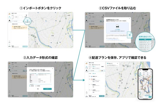 株式会社ナビタイムジャパン(代表取締役社長:大西啓介、本社:東京都港区)は、複数の配達先を登録し、移動手段に合った効率の良い配達ルートを作成できる『配達NAVITIME』のPC向けWebサイトにて、2025年12月12日(金)より、住所リストのCSVファイルインポートに対応し、多数の配達先の一括登録が可能となります。