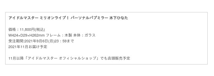 株式会社バンダイナムコアミューズメントは、『アイドルマスター ミリオンライブ! パーソナルパブミラー 木下ひなた』を8月26日(木)に発売します。「木下ひなた」は、「アイドルマスター ミリオンライブ!」に登場するアイドルの一人。7月4日生まれ、身長146cm、特技は天気を当てること。好きなものはおばあちゃんという北海道出身の14歳です。同日より株式会社バンダイナムコエンターテインメントが運営するECサイト、「アソビストア」にて期間限定の受注販売を開始します。