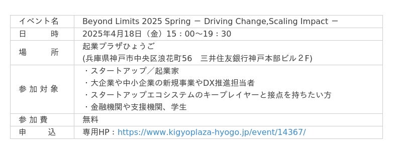 ちゅうぎんキャピタルパートナーズ(岡山市北区 代表取締役 岡田 浩幸)は、起業プラザひょうごで開催されるスタートアップイベント「Beyond Limits 2025 Spring-Driving Change,Scaling Impact-」に協力機関として参画します。