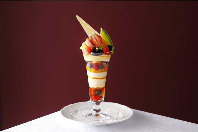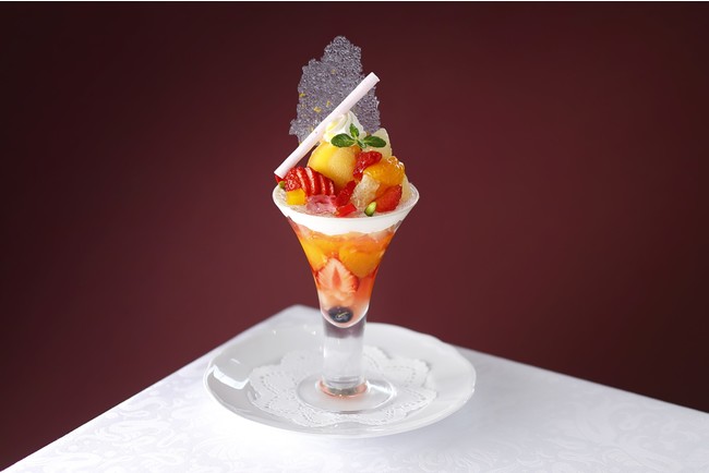 旬の国産柑橘4種【高知県産「文旦」・和歌山県産「清見オレンジ」・熊本県産「デコポン」・愛媛県産「ブラッドオレンジ」】を使い、彩りよく春らしいパフェに仕上げました。伝統のバニラアイスクリーム、苺のゼリー、みかんシャーベットの味わいをお楽しみください。