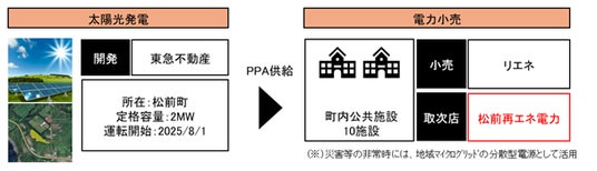 松前再エネ電力株式会社(本社:北海道松前郡松前町、代表取締役:佐藤隆信、以下「松前再エネ電力」)、松前町(所在地:北海道松前郡松前町、町長:若佐智弘、以下「松前町」)、東急不動産株式会社(本社:東京都渋谷区、代表取締役社長:星野浩明、以下「東急不動産」)、株式会社リエネ(本社:東京都渋谷区、代表取締役:小島隆司、以下「リエネ」)、は、松前町内の公共施設10施設に対し、同町内に東急不動産が所有する再生可能エネルギー(以下「再エネ」)発電所由来の電力を「地発地消(松前町内で再エネ電源を開発し、開発した電源を地域内で消費する)電源」として、供給開始したことをお知らせいたします。今後もさらに対象施設を拡大し、松前町の掲げる、地域内の使用電力を100%再エネで賄う「RE100まつまえ*」の実現に寄与してまいります。