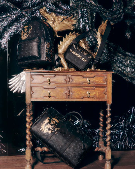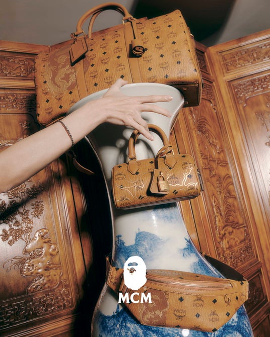 「A BATHING APE(R)︎(ア ベイシング エイプ以下、BAPE(R)︎)」は、ドイツのラグジュアリーファッションハウス「MCM(エムシーエム)」と2019年以来となる2度目のコラボレーションを発表します。金色のドラゴンをまとったAPE HEADをはじめ、BAPE(R)︎のSHARKとMCMのシグネチャーであるモチーフ、Visetos(ヴィセトス)を融合した大胆不敵な柄や遊び心溢れるグラフィックで、旧正月を祝福します。