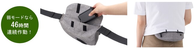 市販のモバイルバッテリーが電源となる便利なUSB式。弱モードなら連続で46時間時間稼働する。上着の裾を固定してスムーズな送風を実現するフック付き。