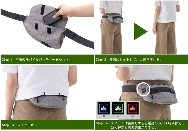誰でも簡単に着用できるので便利。風量はお好みに応じて3段階で調整可能。