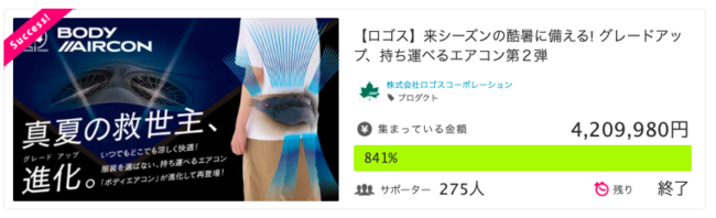 昨年クラウドファンディングにて先行販売したボディエアコンシリーズの「野電 ボディエアコン・Vツインクール」は842%で達成!