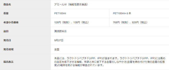『アミールW』(機能性表示食品)は、ラクトトリペプチドの働きにより高めの血圧を低下させ、年齢と共に低下する血管のしなやかさの維持を助ける乳性飲料です。「血圧」と「血管」の2つの機能をうたった商品は飲料で初めてです。『カルピス』に由来する長年の乳酸菌研究から生まれた乳由来の成分ラクトトリペプチド配合で、まろやかでコクのあるやさしい味わいです。