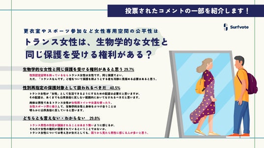 木村正人氏がSurfvoteでみんなの意見を募集。【性別再指定の保護対象として扱われるべき】を選択した人が回答者の約4割。「同等の権利を主張することは現実的に難しいのではないか」との声も。