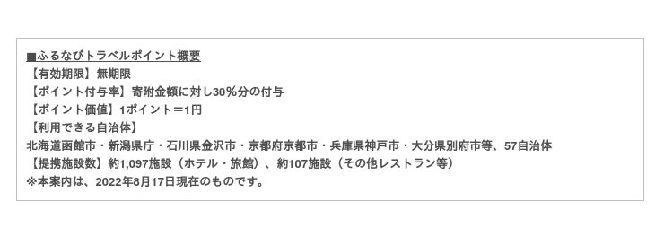 ふるさと納税先にある提携ホテル・旅館で利用可能な、無期限の電子ポイント(トラベルポイント)が返礼品として付与される、初めての方にも判りやすいふるさと納税サービスです。