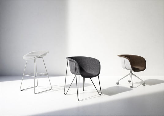 Refelt(リフェルト)は、リサイクルPET繊維を約50%含むポリエステルフェルトを採用した環境配慮型チェアです。フェルトは耐久性、通気性、軽量性に優れ、国内製造によりCO2排出量を削減。3次元プレス成型による背座シェルは身体を包み込むデザインで、フランジ部がアームレストとして機能します。高張力スチールの脚フレームが軽やかさを演出。2色のフェルトに加え、多様な張り生地のオプションも用意し、オフィス空間に洗練された印象を与えます。