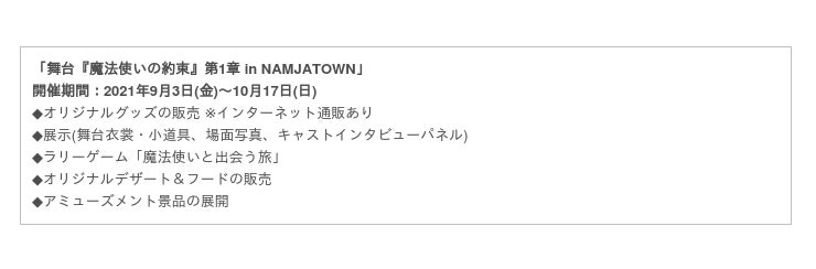 株式会社バンダイナムコアミューズメントが運営する体験型複合施設「NAMJATOWN(ナンジャタウン)」(東京・池袋)は、舞台『魔法使いの約束』第2章の上演決定を記念したコラボレーション催事「舞台『魔法使いの約束』第1章 in NAMJATOWN」を2021年9月3日(金)から10月17日(日)まで開催します。