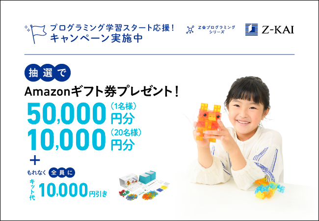 小学生向けプログラミング通信教育「Z会プログラミング講座 みらい with ソニー・グローバルエデュケーション」または「Z会プログラミング講座 with LEGO(R) Education」をお申し込みの方で、同時にキットご購入の方を対象に、抽選で1名の方に50,000円分、20名の方に10,000円分のAmazonギフト券をプレゼントするキャンペーンを実施中です。現在、キット代もZ会特別価格よりさらに10,000円引きとなっており、大変おトクに始めていただけるチャンスです!