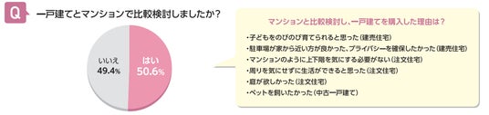 一戸建て購入者にマンションと比較検討したか聞いたところ、「比較検討した」と回答した人は50.6%でした。半数以上がマンションと悩みながら一戸建てを購入したようです。比較検討した結果一戸建てを購入した理由では、「上下階に気を遣う必要がない」「周りを気にしなくて良い」という声が多数上がり、プライバシーを確保できる点をメリットに感じる人が多いようです。