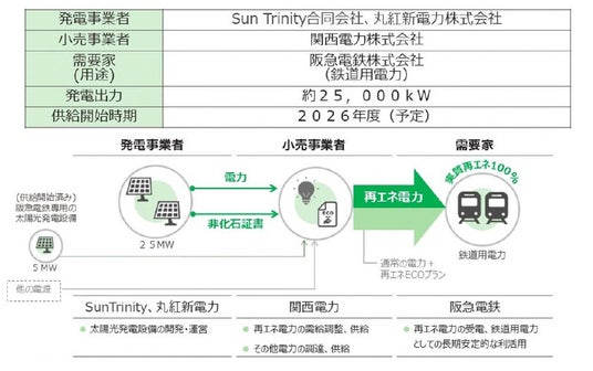 阪急電鉄では、本日鉄道用電力においてコーポレートPPA※1を25MW分追加契約しました。これにより、2025年4月に受電を開始したコーポレートPPA 5MW分と合わせて合計30MWのコーポレートPPAを契約したこととなります。今回の追加契約は関西電力との間で締結したもので、Sun Trinity合同会社および丸紅新電力株式会社を発電事業者とし、新たな太陽光発電設備の開発・運営により発電される電力を活用します。
