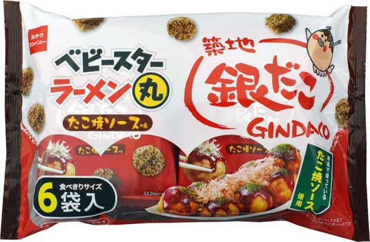 『築地銀だこ』とのコラボ企画は、2016年から幅広麺のドデカイラーメンで6回実施し、2020年からひとくちサイズのラーメン丸においても4回実施した大好評企画です。この度、ひとくちサイズで食べやすい、たこ焼のようなコロコロッと丸いビッツ形状が特徴のラーメン丸とのコラボ商品「ベビースターラーメン丸(築地銀だこ たこ焼ソース味)」が食べ切りサイズの6袋パックになって再登場します!