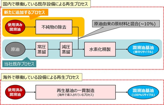 1.使用済み潤滑油の不純物を国内の設備で取り除き、当社の潤滑油基油の製造プロセスに加えた場合の技術実証と環境への影響を評価